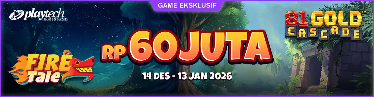 Game Eksklusif Playtech untuk Fire Tale dan 81 Gold Cascade akan berlangsung mulai 14 Desember 2025 hingga 13 Januari 2026 setiap hari dari pukul 00:00 WIB - 23:59 WIB. Total hadiah cash drop sebesar RP 60.000.000 akan dibagikan kepada 1.500 pemain beruntung.